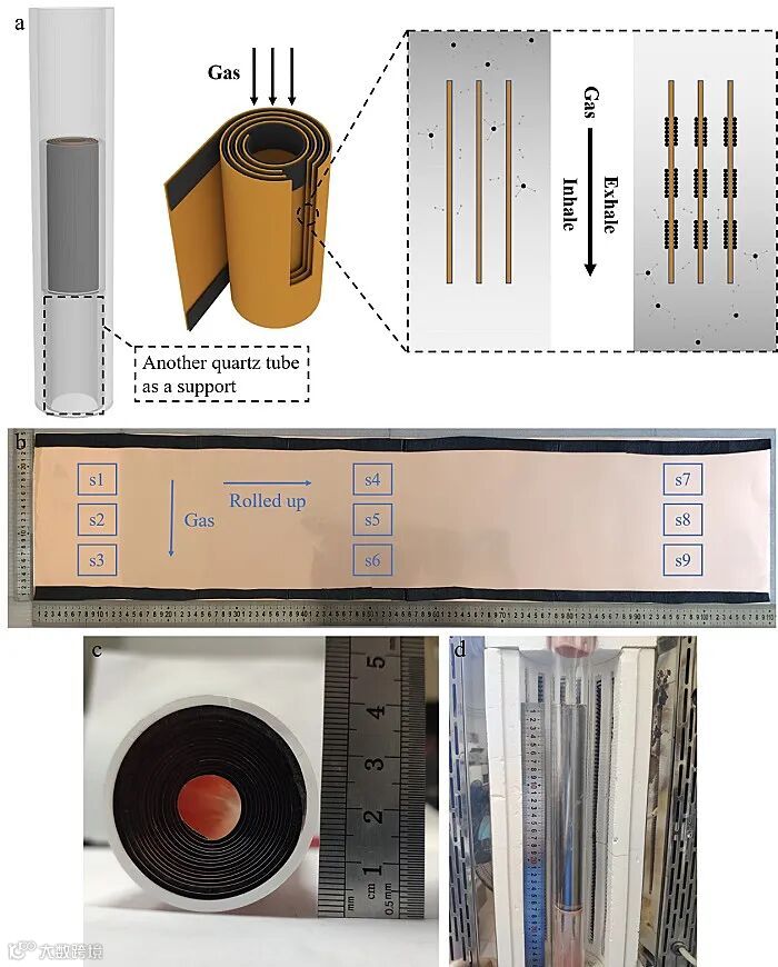 近日,电子科技大学电子科学与工程学院李雪松教授课题组和中国科学院重庆绿色智能技术研究院史浩飞课题组在期刊Chemical Engineering Journal 上合作发表论文,报道了一种“呼吸式”CVD方法,它可以有效利用反应器空间,用小反应器制备大面积石墨烯薄膜。将矩形铜箔基底卷绕成螺旋状,在螺旋体两端的铜层之间放置石墨垫条,以避免铜箔在高温下粘附,同时在螺旋体内的铜箔层间留出足够的空间进行气体交换。反应气体以一种类似呼吸的方式引入,通过反复增加和降低反应器内的压力,来改变反应器内的气体。另外,为了避免中间的铜箔因高温软化和重力而崩塌,将铜螺旋体垂直放置。用这种方法制备的石墨烯薄膜的尺寸是传统方法的几十倍,如实验中用2英寸管径的CVD反应器出制备1.1 m × 0.25 m的大面积高质量石墨烯薄膜。另外,石墨烯薄膜的横向长度(1.1 m)是反应器管内径(0.044 m)的25倍。
