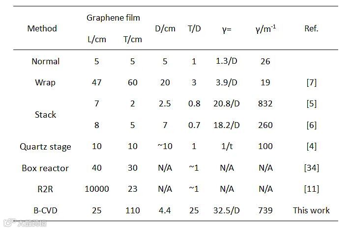 表1. 各种大面积制备石墨烯方式的对比。L是石墨烯薄膜的纵向长度,T是横向长度,D是反应室的直径,γ是衡量铜箔在反应室内的截面空间占据比例。