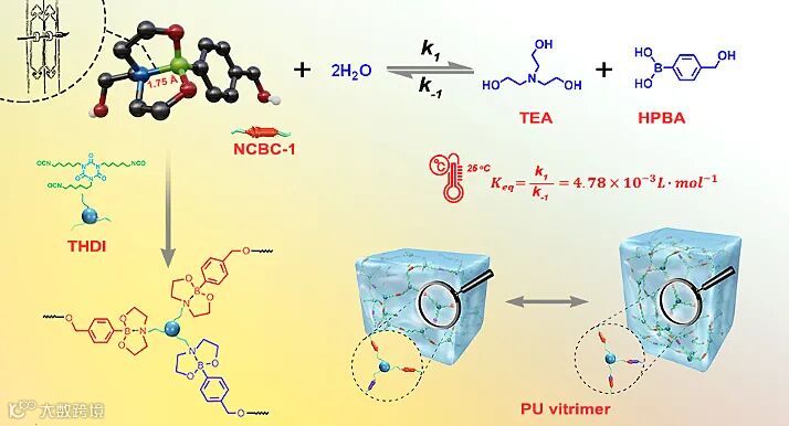 恰当地利用硼酸酯化学是改善硼酸酯基可逆交联高分子稳定性的关键所在。近日,西安交通大学井新利教授团队利用B-N内配位的环状硼酸酯(NCB)基很好地解决了上述问题。该研究团队通过小分子模型化合物深入研究了NCB基的水解稳定性和动态共价化学,NCB基既表现出优异的水解稳定性又能在温和的条件下发生酯交换反应。在充分理解NCB基动态共价化学的基础上,该研究团队通过成熟的化学反应,将这种高稳定性的硼酸酯结构引入到高分子交联网络中,合成得到了基于NCB基的聚氨酯(PU)vitrimers和聚(脲-氨酯)(PUU)vitrimers。