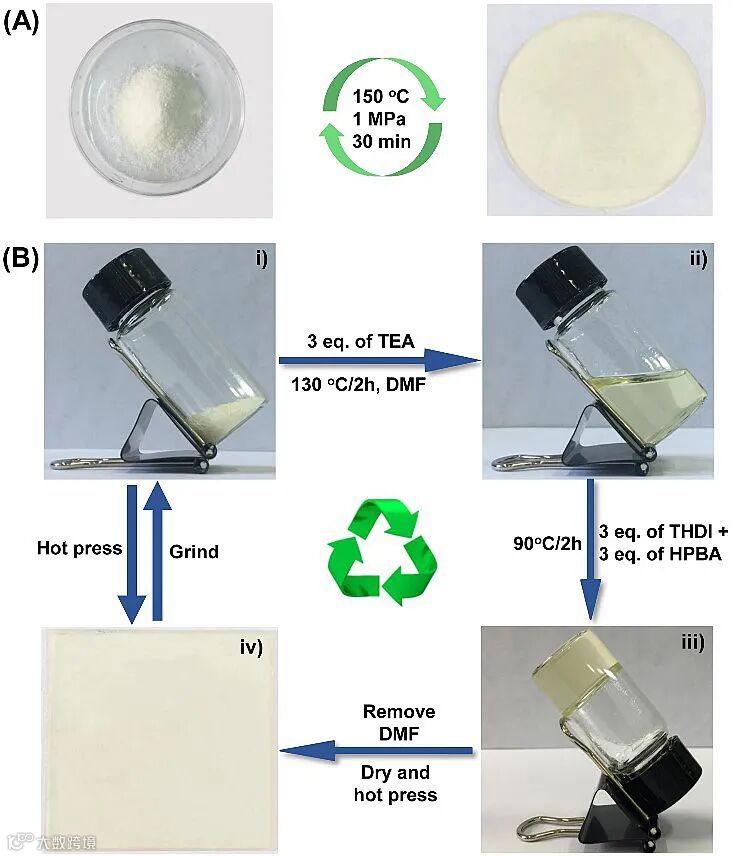 图2. PU vitrimers的再加工和回收过程
