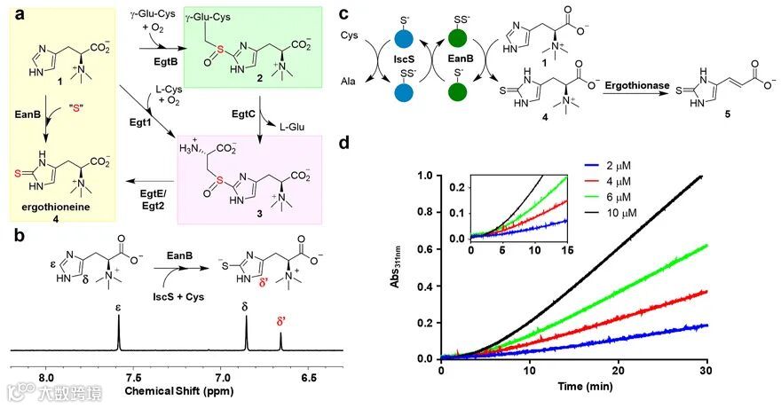 在该研究中,刘平华课题组发展了一种偶联检测麦角硫因的手段,先将麦角硫因降解为化合物(5),该化合物具有以311 nm为中心的强吸收特征(ε311nm=1.8×105 M-1•cm-1),因此监测311 nm处的峰值即可测量麦角硫因的生成量。这一方法不仅比文献中利用1H-NMR检测简便,而且还可以准确测定酶EanB相关的动力学参数。当利用新方法对已报道文献中IscS-EanB酶偶联的麦角硫因检测时,刘平华课题组得到了两个意外的发现。首先,化合物(5)的形成具有5 min滞后阶段(图1d)。其次,反应混合物在4 h后变得浑浊,分析推定其主要成分是单质硫(S8)。值得一提的是,有文献指出,当使用IscS作为硫转移介质时,如果不存在合适的硫受体,IscS催化将导致单质硫(S8)的积累(Acta, Mol. Cell Res., 2015, 1853, 1470−1480; Proc. Natl. Acad. Sci. U. S. A., 1993, 90, 2754-2758.)。因此,基于麦角硫因酶偶联测定的结果,他们推测Cys-IscS可能不是EanB催化的直接硫源。