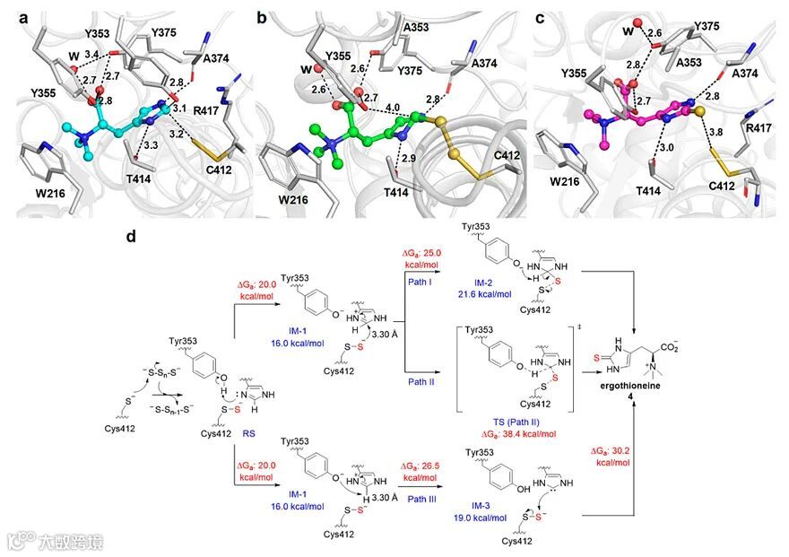 将EanBY353A与多聚硫和(1)进行共晶,周佳海课题组成功的观察到另外两个状态,即EanBY353A-hercynine-过硫化共价中间体(图2b)和EanBY353A-麦角硫因与过硫化Cys412二元复合物(图2c)。对于EanBY353A,Tyr355的-OH更接近于(1)的ε-C(4.0 Å),部分填补了Tyr353在EanBWT中占据的空间。此外,在EanBY353A突变体复合物结构中,Cys412呈三硫键形式,而不是在EanBWT中的二硫键形式,这可能是由于将Tyr353突变为较小的Ala残基而产生了额外的空间(图2b)。更重要的是,过硫化物直接以四面体构型与Hercynine(1)的ε-C相连,暗示这种状态是捕获的包含四面体中间体的C-S键。对于带有过硫化Cys412的EanBY353A-麦角硫因二元复合物(图2c),作者将此结果归因于该突变体非常低的活性水平,以及在长达两周的结晶过程中一些四面体中间体的产生可能导致了该产物的形成。