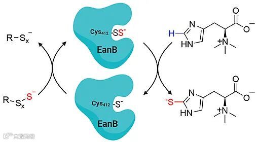 近日,波士顿大学化学系刘平华、崔强实验室联合中科院上海有机所周佳海团队等发现多聚硫(Polysulfide)可作为麦角硫因(Ergothioneine)厌氧生物合成途径的硫源给体,EanB能直接催化惰性C-H键并将其转化为C-S键。这是目前发现的第一个以Polysulfide为底物的酶反应,相关成果在线发表在ACS Catalysis 期刊上。