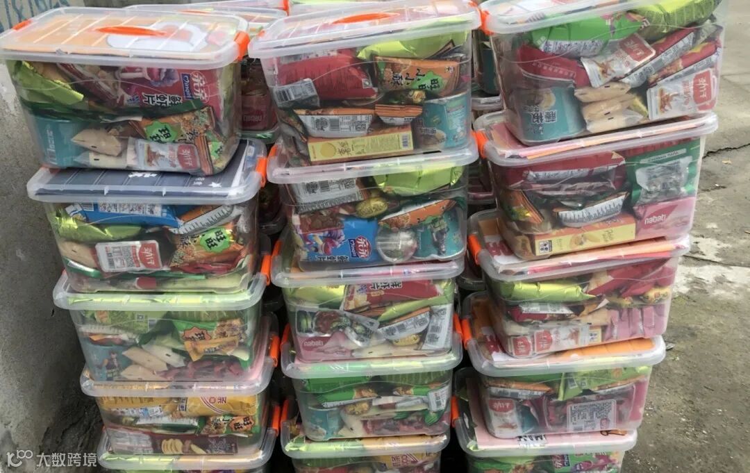 放置一个装满零食的塑料盒子