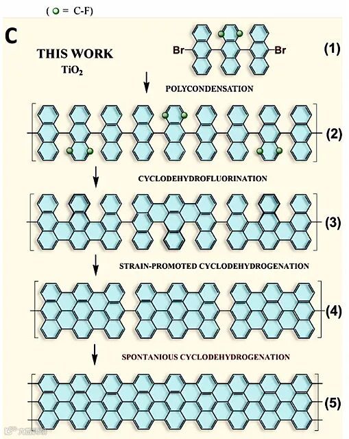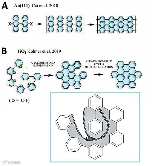 那么,能不能在绝缘或者半导体金属氧化物上直接合成GNRs呢?化学家不是没有想过这么干。不过,虽然过渡金属氧化物具有广泛的化学活性,可用于多相催化,但对于分子内环化而言,金属氧化物的表面缺乏脱氢环化反应催化活性。也就是说,目前用于金属基底上的两步合成策略并不适用于在非金属基底上直接合成平面GNRs。2012年开始,德国埃尔朗根-纽伦堡大学的Konstantin Amsharov教授和美国橡树岭国家实验室(ORNL)的Marek Kolmer博士等人发现多环芳烃前体的分子内芳基-芳基偶联可通过在多种金属氧化物上活化前体的C-F键来实现(Angew. Chem. Int. Ed., 2012, 51, 4594;J. Org. Chem., 2012, 77, 5445),他们由此获得灵感——合理设计氟代芳烃前体的结构,然后通过热引发的顺序脱氢氟环化(cyclodehydrofluorination)反应进行环化,不就可以在金属氧化物表面上直接合成纳米石墨烯或者GNRs了么?经过诸多尝试,他们在2019年发表了一篇Science。其中的关键是柔性氟代芳烃前体上C-F键位置的巧妙选择,使C-F键可以在金红石二氧化钛(011)表面上顺序活化,实现了分子内“多米诺”式区域选择性脱氢氟环化反应,直接合成纳米石墨烯(Science, 2019, 363, 57–60,点击阅读详细),作者把这个过程形象地比喻为一个程序化“拉拉链”的过程(图1B)。但此方法的限制也显而易见——这种结构的“拉链”很快就会“拉到头”,很难形成扩展的sp2碳体系(如GNRs)。