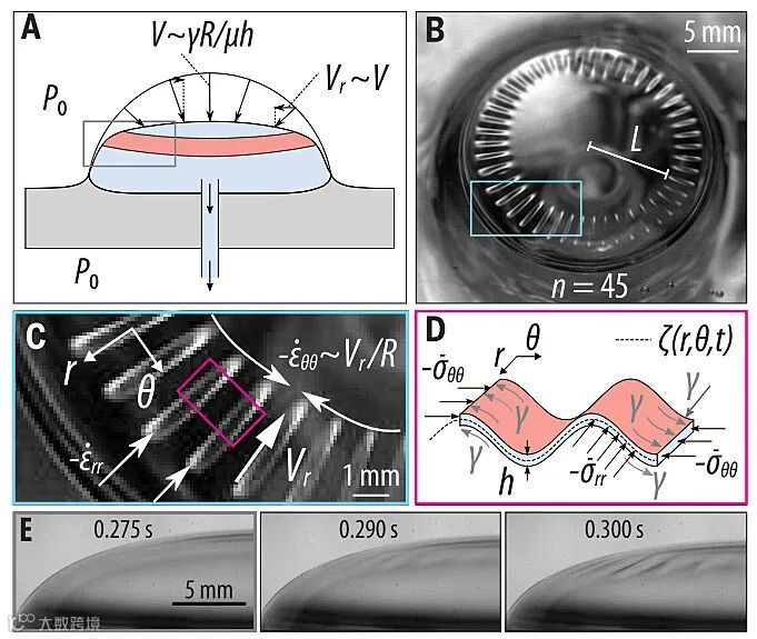 当粘性液体表面气泡破裂时,气泡液膜会形成一个不断扩大的孔洞,使内困的气体得以逸出;气体逸出使得液膜表面力学状态失衡,在应力作用下液膜表面呈现褶皱现象(表面起皱)。以往的研究认为,这种液膜表面起皱现象源自于薄膜自身重量及气泡表面孔洞结构几何约束的共同作用,但Bird教授等人的实验证明真正起作用的“另有其人”。Bird教授研究团队通过硅油表面气泡破裂过程的系统研究发现,诱发气泡破裂的作用力中毛细作用力与重力的比值约为80,表明表面张力在气泡破裂过程中起主要作用,而重力的作用几可忽略不计。