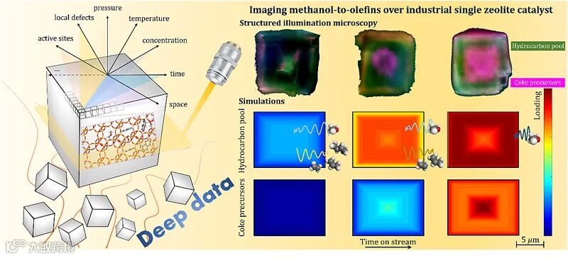 图1. 多尺度反应与扩散模拟结合时空分辨光谱用于甲醇制烯烃过程分子筛晶体中的动态演化研究。图片来源:Nat. Commun.
