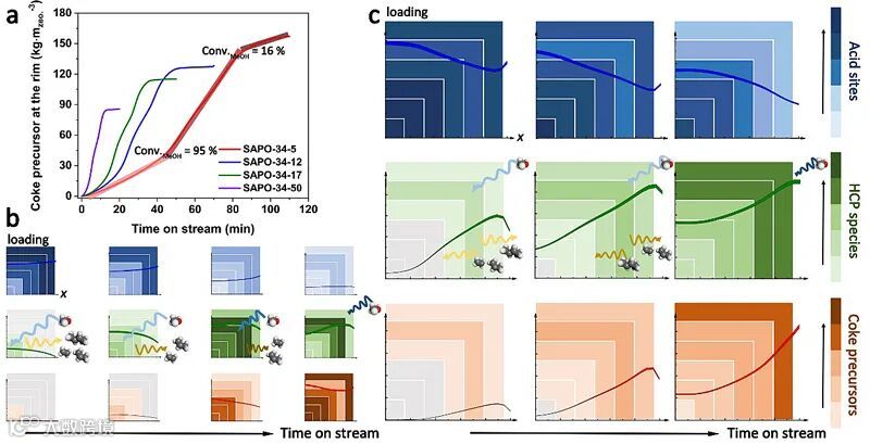 基于所验证的反应-扩散模型,图2显示出了反应-扩散模型所计算的不同晶体粒度SAPO-34分子筛催化甲醇制烯烃反应过程,单一晶体中的酸性位点以及积碳物种的时空演化过程。通过模拟计算进一步研究了反应过程中,单一分子筛晶体外边缘积碳前驱体形成的速率及催化失活的关联。图2a显示,分子筛晶体外边缘形成积碳的速率以及积碳的最大容纳量对于催化失活的速率有直接的关联。图2b和c提出了分子筛晶体粒度对于反应物、气相产物、积碳物种和酸性活性中心落位的影响示意图。晶体粒度直接决定了气相物种的扩散以及积碳活性物种的生成落位。
