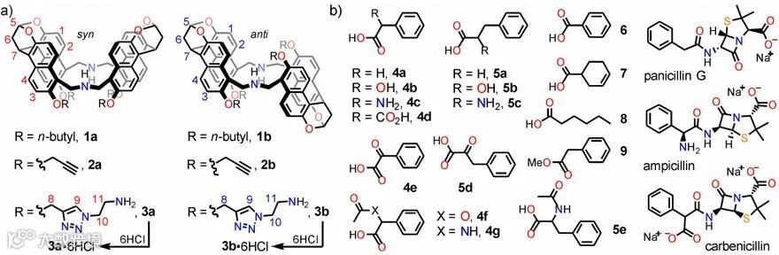 图2. (a) 仲胺萘管的化学结构;(b) 羧酸客体及相关化合物的化学结构。图片来源:Angew. Chem. Int. Ed.