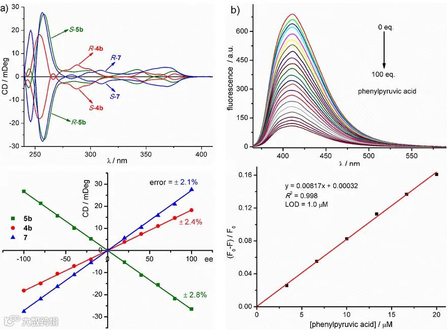 图3. (a) 手性羧酸诱导的CD光谱图和相应的ee值分析的标准曲线;(b) 苯丙酮酸的荧光检测及标准曲线。图片来源:Angew. Chem. Int. Ed.