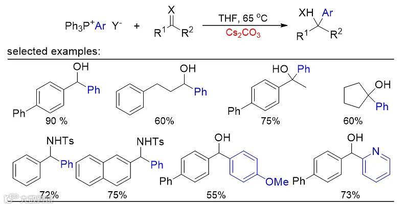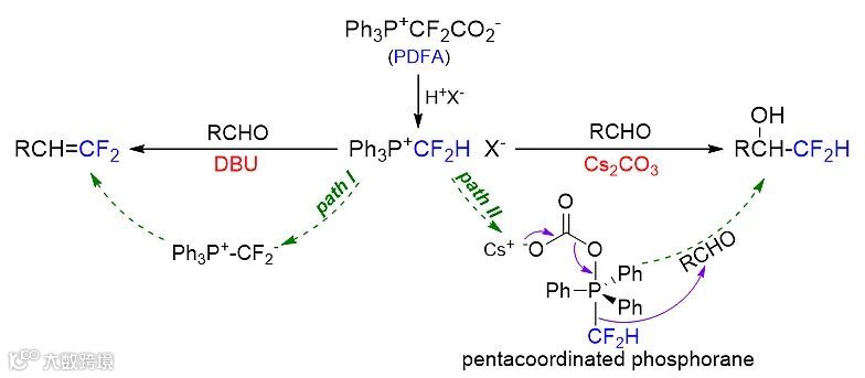 PDFA在酸性条件下很容易转化成二氟甲基鏻盐,Ph3P+CF2H X-,该二氟甲基鏻盐也是一个较好的叶立德前体,可以在DBU等碱的作用下“拔氢产生叶立德”、从而发生Wittig二氟烯基化(图2,path I)。意外的是,如果以碳酸铯作碱,并未发生预期的Wittig反应,生成的却是二氟甲基化产物(图2,path II)。机理研究表明,碳酸铯并没有像DBU那样去拔氢、而是碳酸根中的氧去进攻鏻盐中的磷,发生的是亲核二氟甲基化。这是鏻盐一种新的反应性能,在此基础上,他们还实现了各种醛、酮和亚胺的亲核芳基化及杂芳基化(Nat. Commun., 2016, 7, 10337)。