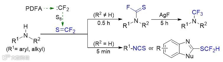 硫代碳酰氟是含氟药物分子合成中一种很有用的含氟砌块,但是其制备非常困难。肖吉昌课题组在发现PDFA与单质硫作用生成硫代碳酰氟的反应后,进一步研究了其反应性能。他们发现,硫代碳酰氟可以与各种各样的胺发生反应,分别得到硫代氟甲酰胺(可进一步转化为三氟甲基胺)、异硫氰和二氟甲硫基取代的芳香杂环(图6)。反应温和高效,硫代碳酰氟在反应体系中现场产生、现场转化,有效避免了单独制备和分离硫代碳酰氟所带来的不便(Angew. Chem. Int. Ed., 2017, 56, 16669-16673)。