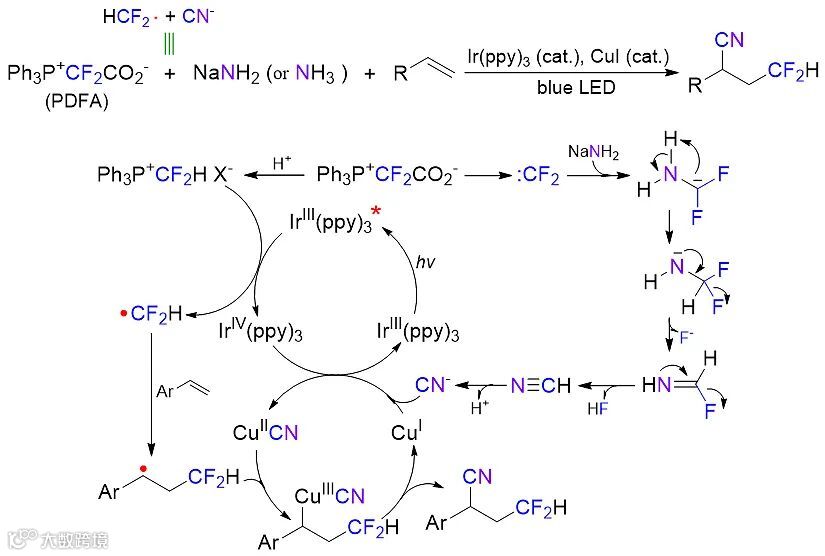 肖吉昌课题组发现,除硫和氧外,二氟卡宾也能与合适的氮源如氨基钠或氨气作用、产生氰根离子,他们利用这一过程实现了光催化下烯烃的氰基/二氟甲基化(图8)。反应中PDFA既作为二氟卡宾试剂提供CN-的碳源、又可捕获质子产生HCF2•自由基,实现了光催化和过渡金属催化的协同进行(Angew. Chem. Int. Ed., 2019, 58, 6079-6083)。