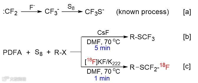 已有研究结果表明:二氟卡宾与氟离子结合成三氟甲基负离子后、可以与单质硫反应产生三氟甲硫基负离子(图4, [a]),进而实现三氟甲硫基化。基于这样的认识,肖吉昌课题组发现,由PDFA产生的二氟卡宾确实能与氟离子和硫反应,实现卤代烷的三氟甲硫基化(图4, [b])。该反应速度非常快、且需外加氟离子,他们与哈佛医学院的Steven H. Liang合作,将该策略成功应用于18F标记,实现了首例18F标记的三氟甲硫基化(图4, [c])(Angew. Chem. Int. Ed., 2015, 54, 13236-13240)。