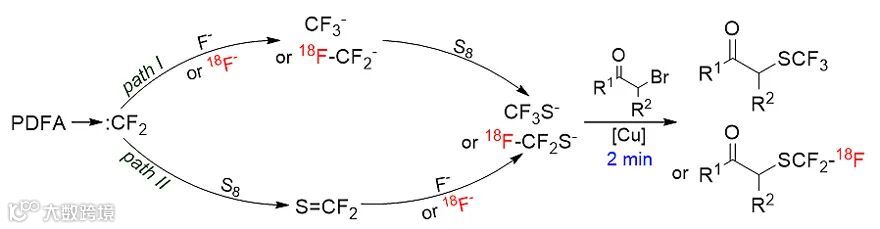 然而,进一步的机理研究表明,从PDFA产生的二氟卡宾并不是先结合氟离子成三氟甲基负离子(图5,path I)、而是先与硫反应生成硫代碳酰氟(图5,path II),然后再结合氟离子形成三氟甲硫基负离子。这个反应展现了二氟卡宾一类新的反应性能,可望发展成一种制备硫代碳酰氟的简便方法。这样产生的三氟甲硫基负离子可以很好地实现α-溴代羰基化合物的三氟甲硫基化,也同样发展成了一种高效的18F标记方法。基于18F标记在PET(正电子发射断层扫描)技术中的重要性,PDFA这一新的二氟卡宾试剂有望应用于PET医学影像诊断试剂的研发(Angew. Chem. Int. Ed., 2017, 56, 3196-3200)。