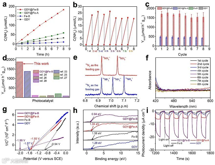图4. 石墨炔/四氧化三铁光催化固氮性能、能带分布及光响应能力表征。