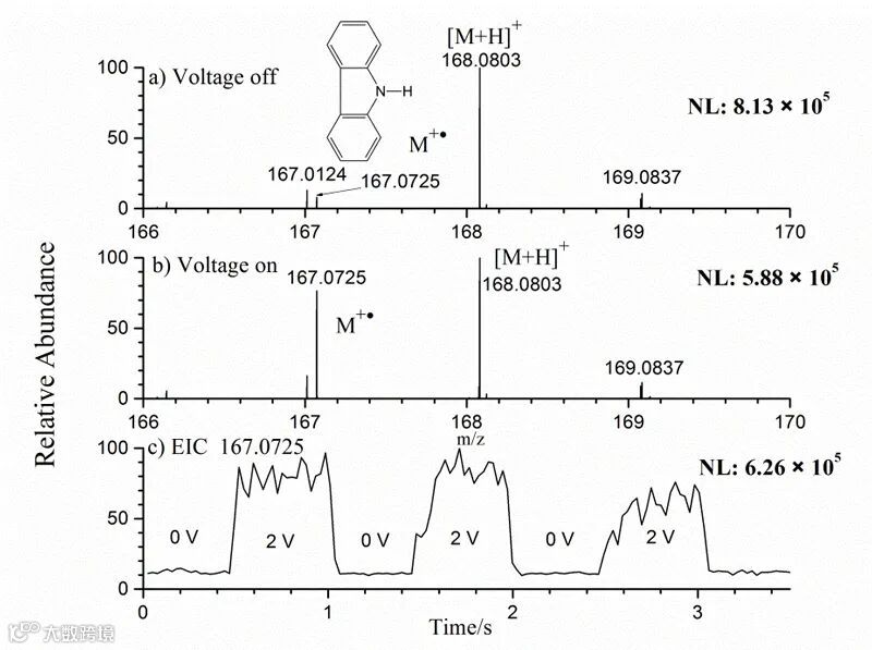 图2. 当转动工作电极分别时施加(a)0 V和(b)2 V时,基于咔唑溶液的获取的原位质谱图;(c)咔唑自由基阳离子(m/z 167.0725)的提取离子流强度与工作电极电压的关系。