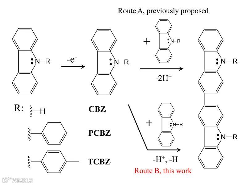 图3. 前人认为,在电极表面,咔唑类化合物首先被电化学反应氧化成咔唑自由基阳离子,然后两个自由基阳离子耦合生成二聚体(Route A);本工作提出新生成的自由基阳离子可能是与咔唑分子通过分子-离子反应产生二聚体(Route B)。