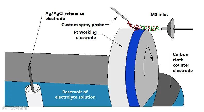 图1. 原位捕获电极表面电化学反应中间体的质谱分析装置示意图。