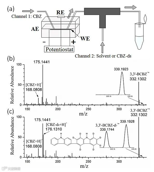 A:如上所述,我们的研究兴趣是利用质谱分析技术研究电化学中转瞬即逝的中间体及电化学反应机理。众所周知,咔唑的电化学氧化是制备二聚吲哚生物碱类药物和多聚咔唑类光电材料的一种非常有前景的方法,但是其电化学反应中间体极其不稳定,聚合反应机理不清晰。我们的目标很简单,就是通过原位以及离线的各种定性定量质谱分析技术捕获电化学产生的咔唑自由基阳离子,并研究其接下来的聚合反应。幸运的是,我们课题组在之前的研究工作了积累了研究电化学反应中间体的经验,基于水轮的电化学反应装置可以捕获非常不稳定的咔唑自由基阳离子,结合我们其他的质谱分析技术,可以研究其聚合反应机理,再次证明质谱为电化学反应机理的研究提供一条有效的途径。