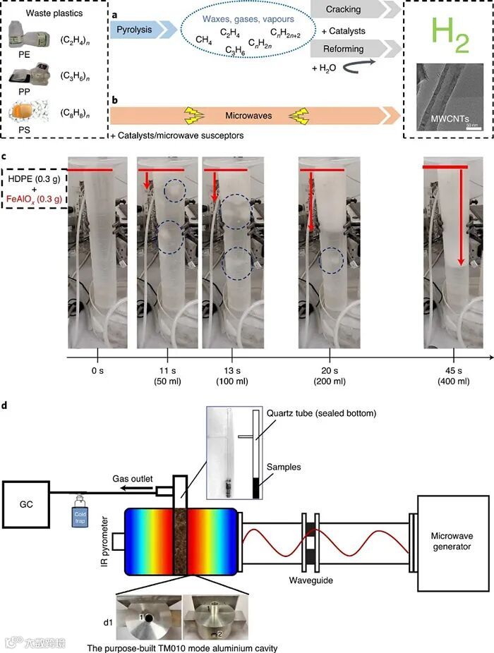 铁基催化剂的制备也非常简单,将硝酸铁、硝酸铝和柠檬酸按照摩尔比1:1:1混合,形成橙色的凝胶,随后在350 °C条件下煅烧3小时,所得的铁铝氧化物颗粒即为催化剂。随后,研究者收集了生活中常见的塑料垃圾,如废牛奶瓶(高密度聚乙烯,HDPE)、废塑料袋(低密度聚乙烯,LDPE)、废食品包装盒(聚丙烯,PP)和废包装材料(聚苯乙烯,PS)。这些垃圾被机械粉碎成1–5 mm的颗粒,然后与等质量的催化剂颗粒均匀混合,装入石英管(下图d)中就可以用于下一步微波激活的降解过程。