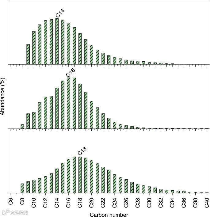 这种新型催化剂整体呈“介孔壳/活性位点/核”结构,铂纳米粒子活性位点位于二氧化硅壳层中介孔的底部(上图)。高密度聚乙烯长链可容易地在孔内移动,不过随后的逸出却受到聚合物-表面相互作用的抑制。这与蛋白质底物在蛋白酶催化裂隙中的结合和转运很类似。如此一来,介孔底部的铂纳米粒子活性位点就可以催化聚乙烯长链进行氢解反应,产生链长分布窄且可调节的烷烃产物。通过调节催化剂孔径,分别得到以C14、C16、C18为碳链分布中心的链烃混合物,为进一步转化和制造柴油以及润滑油提供了可能。
