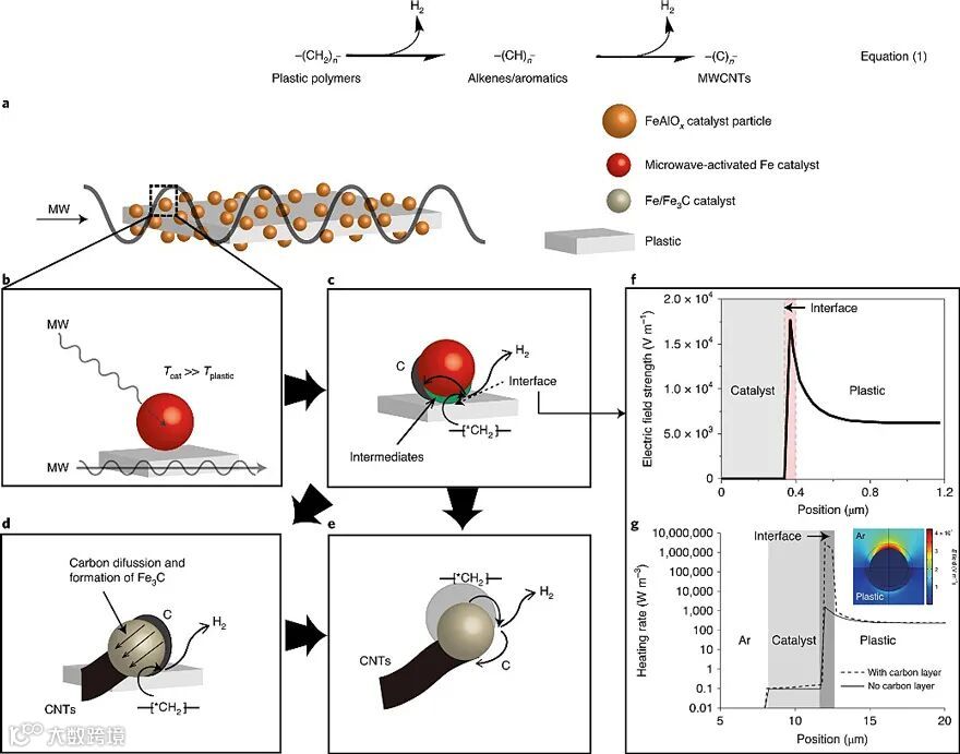 研究者初步推测了该反应的机理。微波作为能量来源将铁基催化剂颗粒加热,与传统加热法不同,这种铁基催化剂颗粒能够更有效地吸收微波能量,与塑料颗粒之间的温差超过400 °C,并通过热传递和热对流将周围的塑料颗粒活化。微波激发法之所以实现了良好的氢气产量,一方面是因为极大地减少了常规塑料热分解中多见的副反应,使得C–H键的断裂占主导地位;另一方面,加速了H2扩散,离开催化剂表面。与此同时,剩下的碳与催化剂形成Fe3C,并随后形成多壁碳纳米管。
