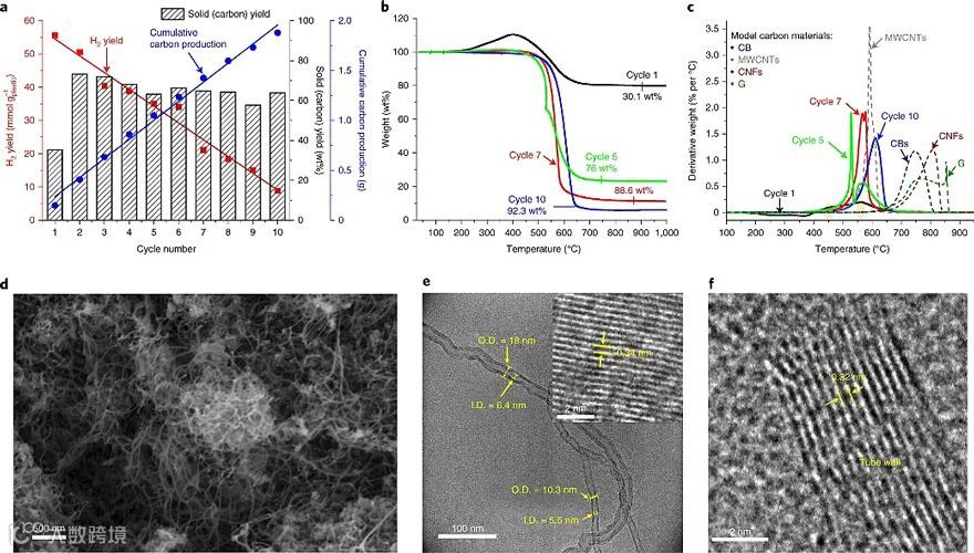 更有意思的是,塑料降解提氢后剩下的固体残留物主要是多壁碳纳米管,其高价值使得这种微波分解塑料法具有更大的商业意义。微波作用下,碳沉积在催化剂表面,每个循环实验(除了循环1)的碳产率几乎是恒定的,并且在连续十次循环后,碳的总产率为~620 mg/g塑料,而其中多壁碳纳米管的质量分数为~92 wt%。