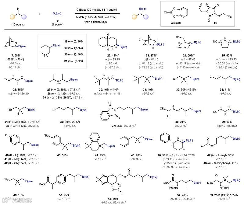 在前期的脱羧硼化研究中,作者发现在可见光照射下,N-羟基邻苯二甲酰亚胺羧酸酯1可以与联硼酸酯2作用生成相应的自由基阴离子3,后者会经历快速脱羧化生成邻苯二甲酰亚胺阴离子4和烷基自由基5,随后5与B2(cat)2反应生成硼酸酯6。如果把N-羟基邻苯二甲酰亚胺羧酸酯1换为相应的醚7,那么产生的自由基阴离子中间体8就不会脱羧,而是生成高活性的氧自由基中间体9,从而可以与烷烃底物10反应,生成相应的碳自由基12,后者与B2(cat)2反应生成相应的硼化物13(图1c)。在此基础上,作者对反应条件进行了优化,最终发现在邻苯二酚氯硼烷(ClB(cat),20 mol %)作为催化剂、N-三氟乙醇邻苯二甲酰亚胺14(1 equiv.)作为氧自由基前体、乙腈作为反应溶剂的条件下,降冰片烷15与联邻苯二酚硼酸酯2于390 nm的紫光照射下反应24 h,然后在Et3N的作用下与频哪醇进行酯交换(由于邻苯二酚硼酸酯16的稳定性较差,不易分离),以61%的收率得到目标产物17。对照实验表明氧自由基前体14和邻苯二酚氯硼烷催化剂对该反应至关重要。在无催化剂参与的条件下,反应不能发生。其他含有氯原子的催化剂(如CeCl6(NEt4)2、NEt4Cl)也能催化该反应,但是收率较差(图1d)。
