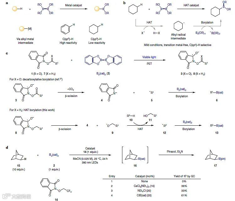近年来,英国布里斯托大学的Varinder K. Aggarwal教授课题组长期致力于有机硼化学的研究,目前已经发展了光驱动的基于羧基、氨基和羟基的硼化反应。机理研究表明这些硼化反应都是通过碳自由基中间体进行的,即羧基、氨基以及羟基等官能团被转化为碳自由基后与联硼酸酯反应生成目标C-B键。在此基础上,作者设想能否利用杂原子自由基(X•)参与的氢原子转移(hydrogen atom transfer, HAT)将C-H键转化为碳自由基,然后通过类似的自由基捕捉过程,便可实现C-H键的硼化反应(图1b)。近日,他们与Adam Noble教授课题组合作,在Nature 上报道了无金属参与光诱导的烷烃C(sp3)-H键硼化反应。该反应不仅条件温和、官能团耐受性好,而且选择性地在一级C-H键上进行硼化。