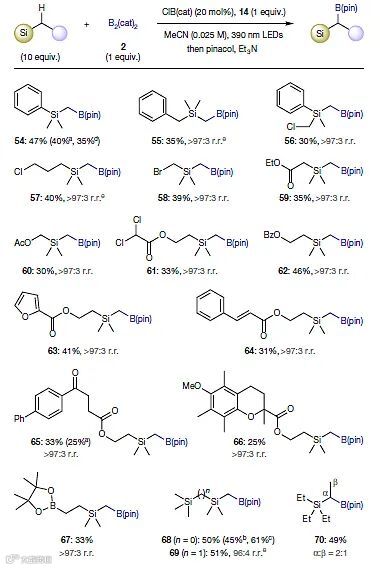 鉴于有机硅烷是合成化学和材料领域的重要中间体,因此作者探索了该硼化反应对于硅烷的使用范围(图3)。由于硅原子对其α位C-H键具有活化作用,所以当使用硅烷作为反应底物时,硼化反应选择性地在硅原子的α位上进行(54-55)。类似地,不同的官能团——如氯原子(56-57)、溴原子(58)、酯基(59-66)、频哪醇硼酸酯(67)都能兼容该反应,以中等的收率(25-46%)得到目标产物。值得一提的是,四乙基硅烷(70)选择性地在亚甲基(α位)上进行硼化反应,而先前报道的铱催化的反应则在甲基(β位)上进行硼化反应。