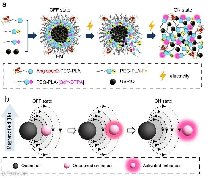图1. 电场响应磁共振探针的结构及响应机制。(a) 目标探针由顺磁性共聚物(外壳)包裹小粒径氧化铁团簇(内核)组成。(b) 由于距离依赖的磁共振谐调效应(distance-dependent magnetic resonance tuning,MRET),超顺磁氧化铁团簇的强磁矩导致空间相邻顺磁性基团的T1加权磁共振信号淬灭(OFF状态)。电场影响下,超顺磁和顺磁基团之间空间距离增加,顺磁性基团T1加权磁共振信号逐渐恢复(ON状态)。