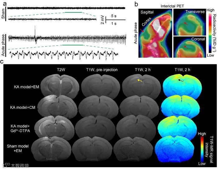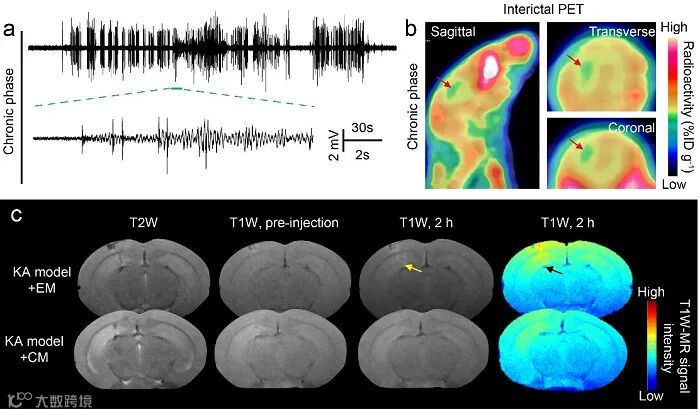 图4. 电场响应探针示踪慢性自发性癫痫小鼠模型病灶。(a)慢性自发性癫痫小鼠模型的颅骨脑电图。(b)慢性自发性癫痫小鼠模型18F-FDG PET成像,箭头指向为低信号强度的癫痫病灶区域。(c)尾静脉注射具有相同Gd3+浓度(0.06 mmol/kg)的EM,CM之前及之后相应时间点的冠状位MR图像。箭头指向癫痫病灶。
