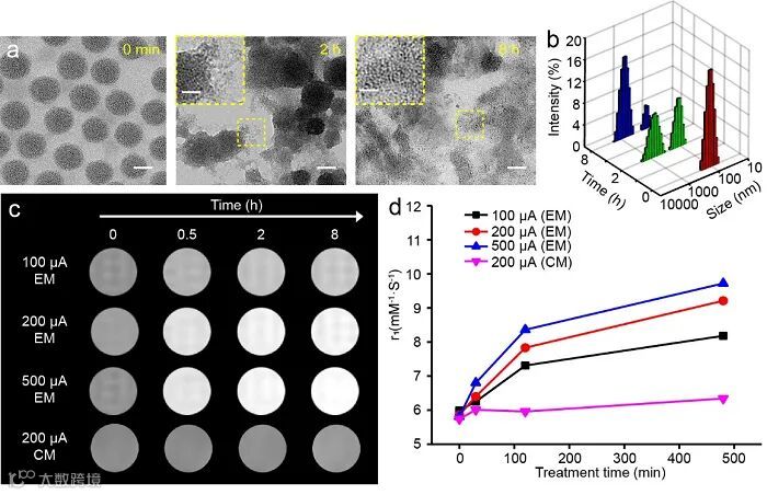 图2. 电场响应探针T1磁豫率与电场强度与通电时间正相关。(a)探针在外电场(200 μA)作用0 h、2 h及8 h后的TEM图像。比例尺= 50 nm和20 nm(嵌入图)。(b)探针在外电场(200 μA)作用0 h、2 h及8 h后的水合粒径。(c)探针在不同通电时间和通电强度下的T1加权磁共振图像。(d)探针的T1弛豫率随外电场施加时间和强度的变化。
