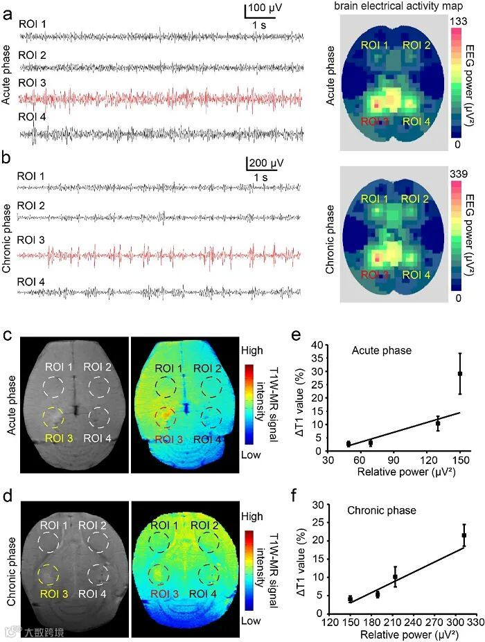 图5. 癫痫小鼠模型脑电功率与电场响应探针MR信号增强正相关。(a,b)急性和慢性期癫痫小鼠脑部不同位点脑电图及脑电地形图。(c,d)急性和慢性癫痫小鼠尾静脉注射电场响应探针2 h后,冠状位T1W-MR图像和伪彩图。(e,f)在急性和慢性期小鼠癫痫模型中,各ROI中的T1信号强度增加百分比与脑内EEG相对功率呈正相关。