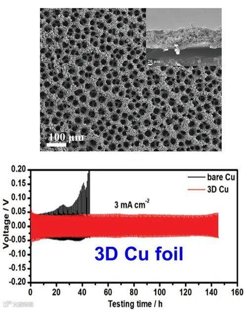 图2. 三维多孔铜箔及电化学性能表征