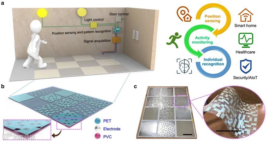 图1. 基于智能地毯的智能地板监控系统。图片来源:Nat. Commun.
