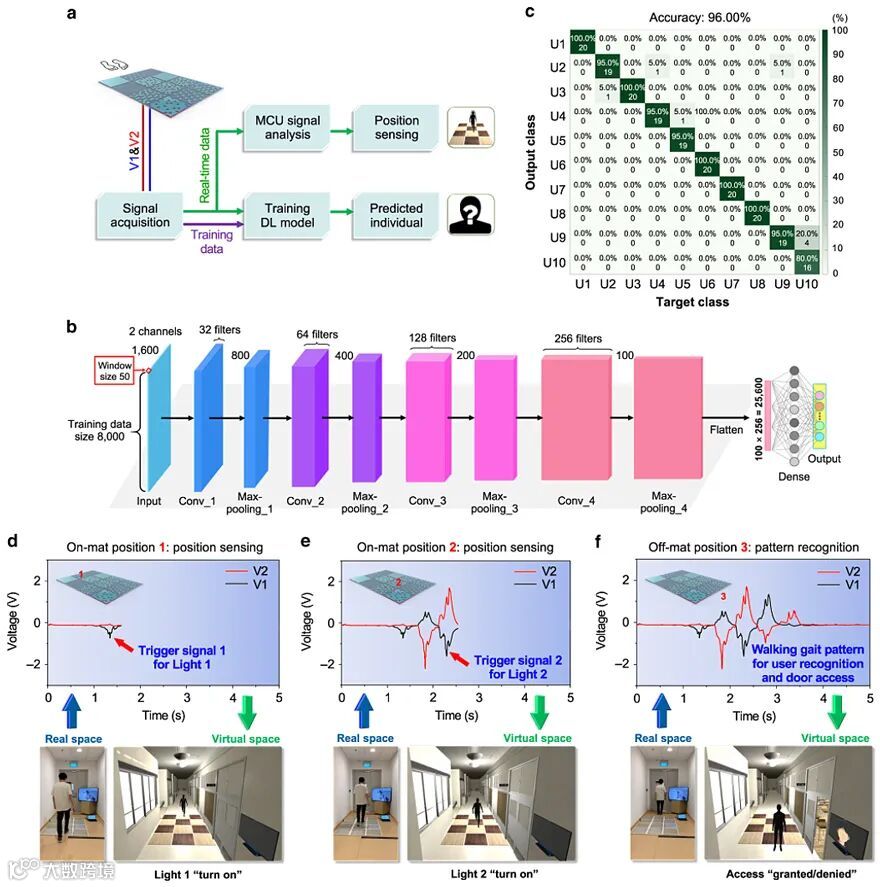 通过把智能地毯采集到的感测信号通过深度学习辅助的数据分析后,一个智能地板监控系统便实现了(图2)。根据时域上的信号分析,使用者在智能地毯阵列上的位置和活动状态可以被实时地监控。此外,通过深度学习辅助的信号分析,使用者的身份信息也可以通过其独特的行走步态来判别。对于共有10个不同使用者的深度学习模型,其平均的判别正确率高达96%。在一个演示的智能建筑场景中,该智能地板监控系统通过获取的使用者的位置信息和身份信息,实现了相应位置照明的自动控制和基于身份信息的自动门禁。由于其出色的位置感测、活动监控和身份识别的功能,该智能地板监控系统在智能建筑和智能家居中具有广阔的应用前景,如控制自动化、跌倒监测、健康监测和安全监控等。