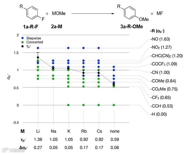 于是在进一步的讨论中,他们把重点放在氟化物的SNAr置换上。由于迄今为止,所考察的模型体系中只有钾离子被视为抗衡阳离子。因此,他们以不同碱金属甲醇盐 2a-M置换1a-RF中的氟化物为基础,研究了抗衡阳离子对SNAr机理的影响(图3)。结果显示,随着抗衡阳离子尺寸的增加,分步机理更占主导地位,即τp–值随着抗衡阳离子的增大而减小。而抗衡阳离子越能稳定氟离去基团上的负电荷,就越利于协同反应机理。