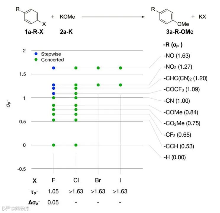 图2. 甲醇钾和苯衍生物置换卤化物的机理转折点。图片来源:J. Am. Chem. Soc.
