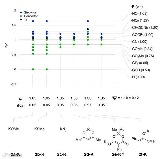 首先,他们研究了甲醇钾置换卤化物类SNAr反应(图2),结果显示只有氟化物置换反应能确定机理转折点,τp– =1.05,而氯化物、溴化物和碘化物的置换机理转折点不在σp–的合理范围内。类似地,在卤化物交换反应中也得到了相似的结果。也就是说,不论是在卤化物交换反应中还是在与甲醇钾的置换反应中,氯化物、溴化物和碘化物都倾向于协同机理。而只有在氟化物的SNAr反应中,分布能量态才具有重要意义。