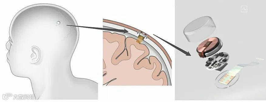 想法很好,但要把柔性的生命体与刚性的机器稳定地联系起来,并让二者顺利完成信息或物质的交互谈何容易。目前人机结合最成功最广泛的应用,毫无疑问是人工耳蜗,可以将声音转换为电信号通过植入体内的电极系统直接刺激听觉神经来恢复或重建听觉,帮助了无数听觉障碍患者。不久前,埃隆•马斯克的Neuralink公司发布了一款硬币大小的脑机接口植入式芯片,通过柔性电极与大脑皮层相连,接收并解码大脑皮层的电信号同时向大脑皮层发送电信号(下图),可无线充电,目前已经在猪的大脑上稳定运行了数月。该技术的目标是帮助残疾人控制仿生假肢,并帮助解决许多健康问题,例如失明、抑郁、阿尔兹海默病、帕金森综合征等,还可实现人脑与智能手机或电脑软件互联。这不得不说是个巨大的突破,但能否获得监管机构批准用于人体实验目前仍是未知之数。