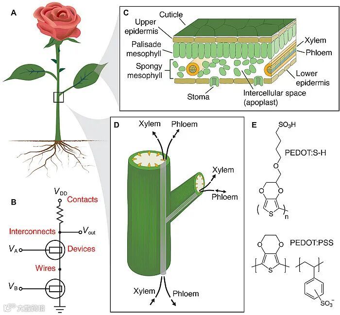 植物中的离电子器件。图片来源:Sci. Adv., 2015, DOI: 10.1126/sciadv.1501136