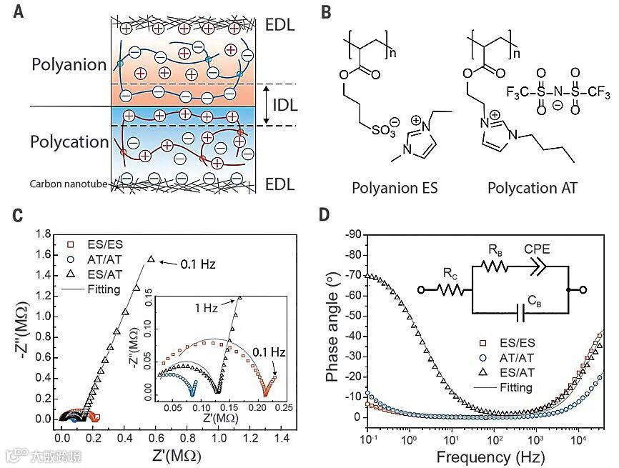 此外,研究人员近期还设计了能够导电的离子弹性体(ionoelastomer),这种固态材料不需要液态电解质,分为聚阴离子弹性体和聚阳离子弹性体(Science, 2020, 367, 773, 点击阅读详细)。这些材料以聚合物为框架,通过反离子的移动实现导电,比如聚阴离子弹性体,带负电荷的阴离子固定在材料上,而阳离子可以随着浓度或者电场进行移动而实现导电。聚阳离子弹性体与此相反。离子弹性体材料与水凝胶相似,在拉伸或者压缩时产生的电信号会发生变化,这说明这些材料可以实现对周围环境以及材料自身变化的响应。