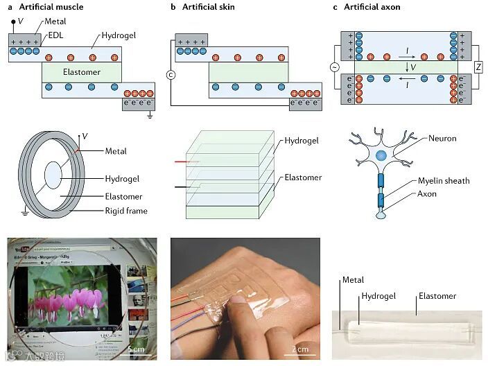水凝胶离电子器件用于人工肌肉、皮肤、神经元。图片来源:Nat. Rev. Mater., 2018, 3, 125