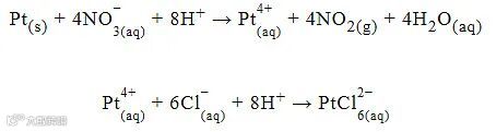 金属溶解的机理可通过氧化和络合机理来解释,例如Pt被HNO3氧化后,与氯离子形成六氯铂酸盐(PtCl62−)离子。在较低pH(pH < 1)下,氯络合物可以稳定存在,而当pH升高后,将水解形成羟基络合物。钯具有较高的电化学电位和氯络合物稳定性,正因为如此,溶解的最快,而铂和铑的溶解则困难得多。