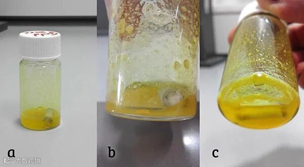 金丝溶解过程(a-c分别为3 h, 5 h, 24 h)。图片来源:Chem. Commun.