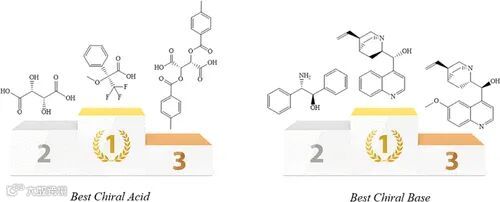 下图是作者认为拆分效果最好的三个手性酸/碱,配上他们推荐的六种溶剂。今后大家再做手性拆分的时候也许可以优先考虑这套“手性拆分工具包”。当然,每个要拆分的化合物结构不一样,性质肯定也是千差万别。本君可不能保证用这个拆分工具包就一定能满足您的要求,但是本君相信仔细研读原文的拆分条件筛选方法一定对您的工作具有借鉴价值,从而提高成功率。