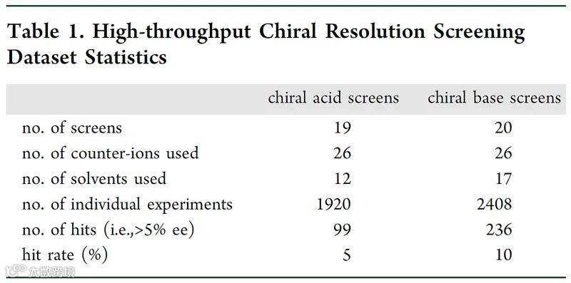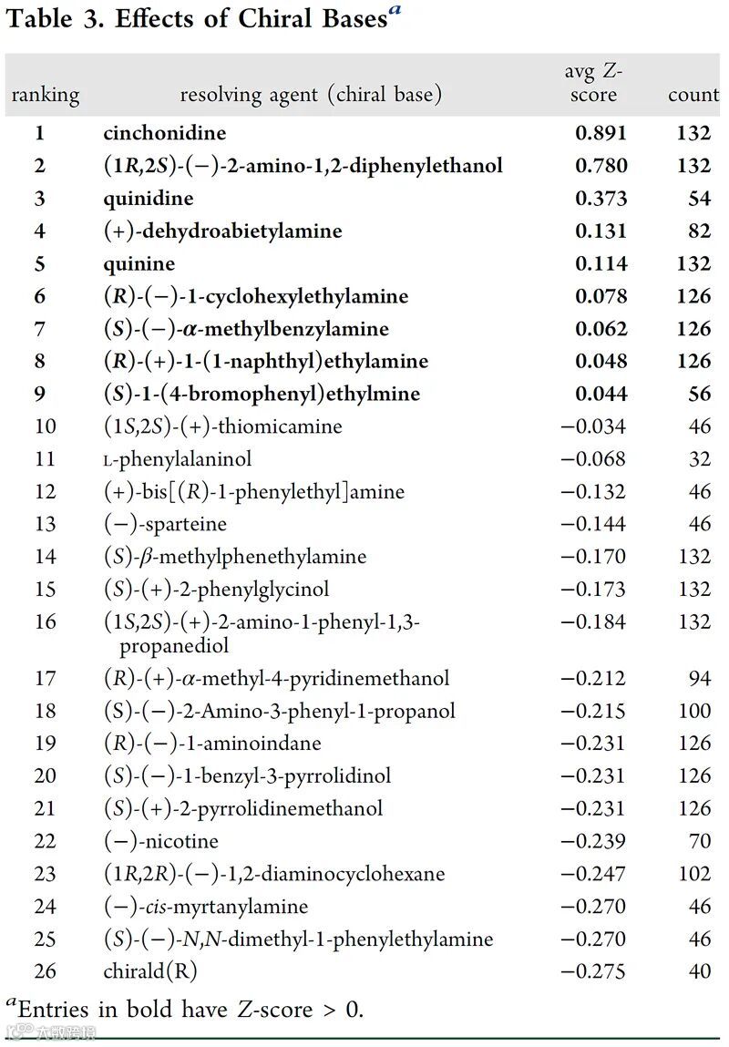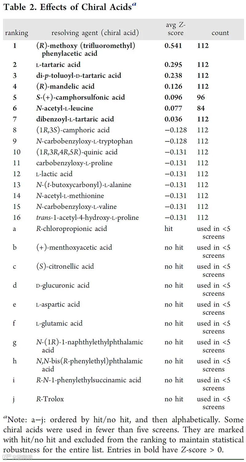 言归正传。作者参考他们以往的数据库,锁定了常用的19种手性酸和20种手性碱进行交叉实验。以每次实验的ee值为基础计算Z值,最终以Z值评价拆分效果,其中Z值为正的被认为具有较好的拆分效果。