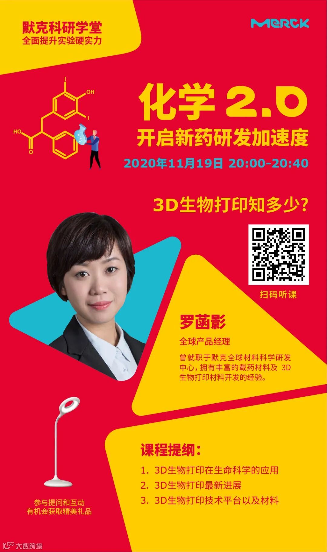 默克化学2.0系列讲座(一):化药研发如何快速打开新类药空间?https://m.qlchat.com/wechat/page/topic-simple-video?topicId=2000010229185682默克化学2.0系列讲座(二):揭秘隐藏在光催化背后的那点事 https://m.qlchat.com/wechat/page/topic-simple-video?topicId=2000010765010555默克化学2.0系列讲座(三):畅聊多肽合成中的那些痛点问题https://m.qlchat.com/wechat/page/topic-simple-video?topicId=2000011968321486 参考资料:[1]https://www.tandfonline.com/doi/abs/10.1080/08977190412331279890[2]https://www.technologyreview.com/s/525161/artificial-organs-may-finally-get-a-blood-supply/[3]https://www.harvardmagazine.com/2017/01/building-toward-a-kidney[4]https://cpb-us-e1.wpmucdn.com/sites.northwestern.edu/dist/1/376/files/2016/01/advancing-the-field-of-3D-biomaterial-printing-1ovgjlq.pdf [5]https://www.sigmaaldrich.com/china-mainland/zh/materials-science/material-science-products.html?TablePage=119940135[6]《用于构建高级结构的聚合物》,Material Matters,第六卷,第三期。[7] Noor, N. et al. (2019) 3D printing of personalized thick and perfusable cardiac patches and hearts. Adv. Sci. 6, 1900344https://www.usatoday.com/story/news/world/2019/04/15/3-d-heart-human-tissue-printed-world-first-israel-scientists/3472200002/
